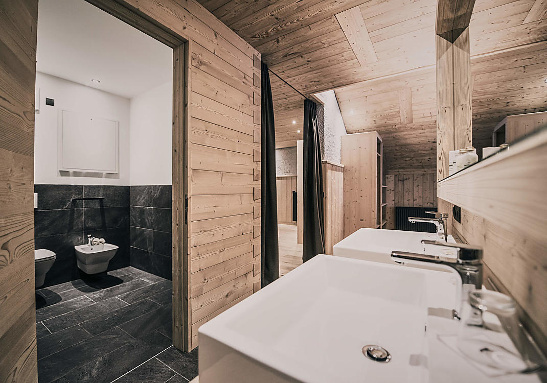 - Badezimmer mit Doppelwaschbecken, Fön, Dusche und getrennter Toilette