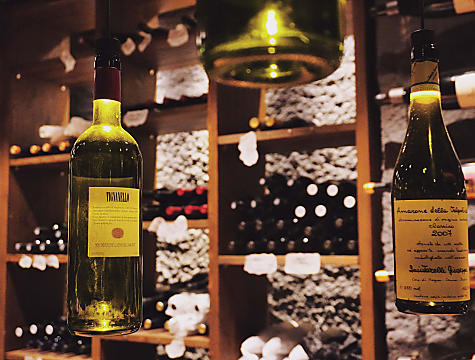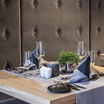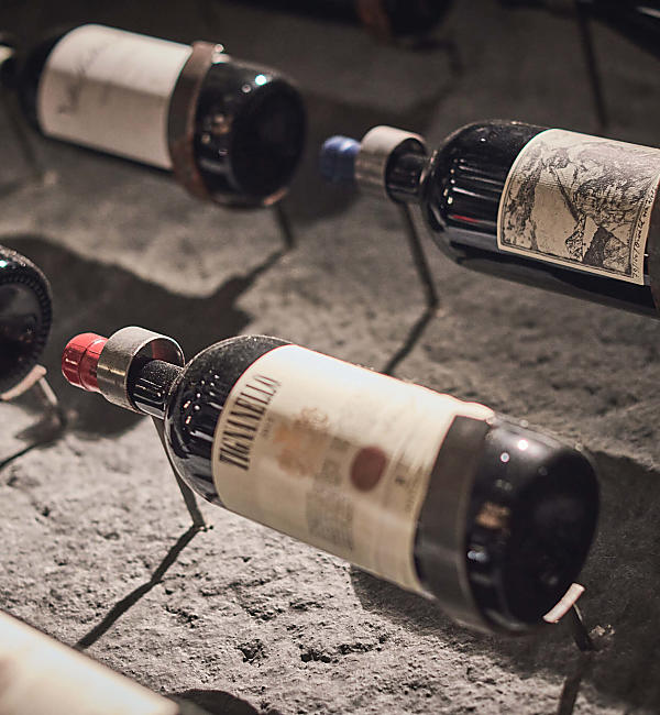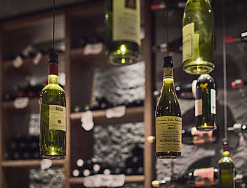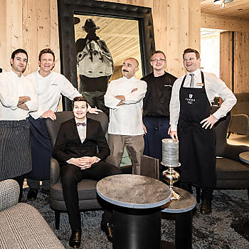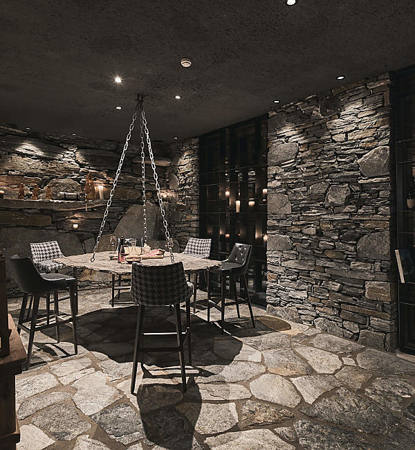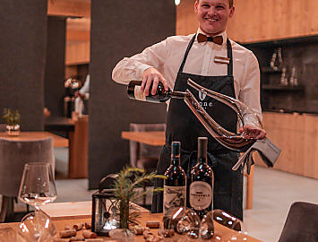 We live the love for the noble wines through and through. From the planning of the wine cellar in silver quartzite from the valley Pfitsch to the selection of each individual wine. The table in the wine cellar: a stone slab hanging from the ceiling on an iron chain. An elegant place perfect for private parties. Daniel Schölzhorn completed the sommelier training together with our restaurant manager Simon Klotz. Because wine inspires us. You can feel that. We are happy to recommend our favorites perfectly matched to your dish and share our love for wine with you. Right now, our wine list contains 500 positions.