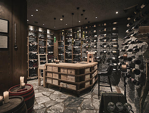 Later, the wine cellar and the outdoor stone jacuzzi were added. We planned these additions together with our architect and our stone mason. With Oberhöller we also got a stone slab from a mountain cottage in Ratschings. Now it hangs as a table from the ceiling in the wine cellar. So, we created a very special wine cellar – designed by us, like the wine cabinet at the bar – perfect for private wine tastings and celebrations.