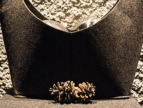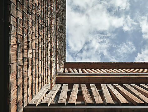 Natural stone walls made of silver quartzite from the valley Pfitsch. Processed by the stone mason Florian Oberhöller from Sarntal. In order not to change the original quality of the stones, they were not struck. They will remain as they had been formed over millions of years by nature. Gruber also planned the Tenne Chalets. There, too, South Tyrolean wood and silver quartzite stones are the central materials.