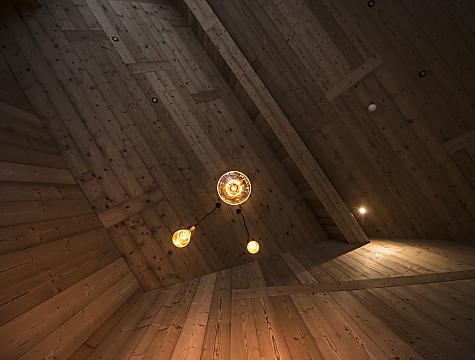The lodges themselves are not conventional rooms. They have the character of a loft – a spacious room with free-standing furniture. A sense of freedom. When you wake up, you look directly at the sun while lying down. While the sleeping and living areas are flooded with light, the dining area is darker – as it is usual in South Tyrolean parlors. No lodge is like the other, each one is individually designed. Not just the room, the furniture too. The couches in the lodges are one of the many examples that architect Gruber designed specifically for the Tenne Lodges. The wood transitions in the lodges were specially cut.