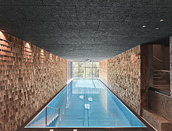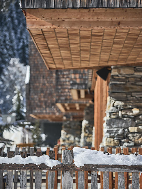 L'architetto Martin Gruber ha progettato l'hotel Tenne Lodges partendo dalla visione di una struttura che rifletta la natura di Racines. Una simbiosi tra la pietra e il legno. Non solo all'esterno. Questi materiali si trovano soprattutto all'interno dell'hotel a 5 stelle. I pavimenti in legno nei lodges, le scandole di legno nell'infinity pool, la cantina di vino e la vasca idromassaggio in pietra all'aperto e molto di piú. Semplice, arcaico e libero.
