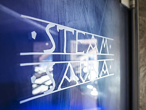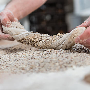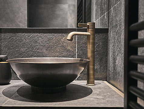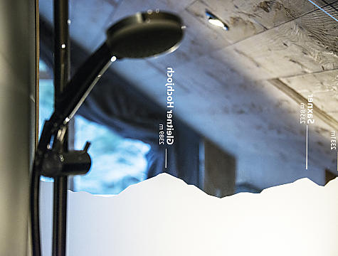 Muri in pietra naturale di quarzite d'argento della Val di Vizze. Elaborazione di Florian Oberhöller della Val Sarentino . Per non alterare la qualità originaria delle pietre, esse non sono state lavorate. Sono come si erano formate nel corso di milioni di anni. Gruber ha progettato anche i Tenne Chalets. Anche qui il legno altoatesino e le pietre di quarzite d'argento della Val di Vizze sono i materiali centrali.