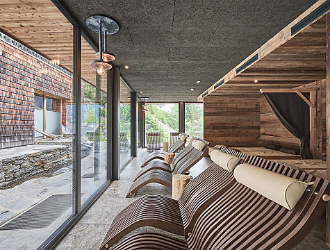 Le fiamme del camino danzano nell’area relax. E cosa c’è di meglio che godersi il rilassamento totale dopo una seduta di sauna? Questo è il luogo perfetto per leggere, dormire, apprezzare il silenzio. Di tanto in tanto, uno sguardo all’esterno, al trambusto delle piste e delle montagne. I lettini a raggi infrarossi riscaldano il corpo internamente e dissolvono qualsiasi tensione. Il Vitalbar offre bevande dissetanti. Chi lo desidera, dopo una sana sudata in sauna o un bagno turco, può rinfrescarsi con una doccia d’ossigeno all’aperto e godersi l’aria frizzante di montagna. Il binomio caldo-freddo che rende felici e rivitalizza mente e corpo.